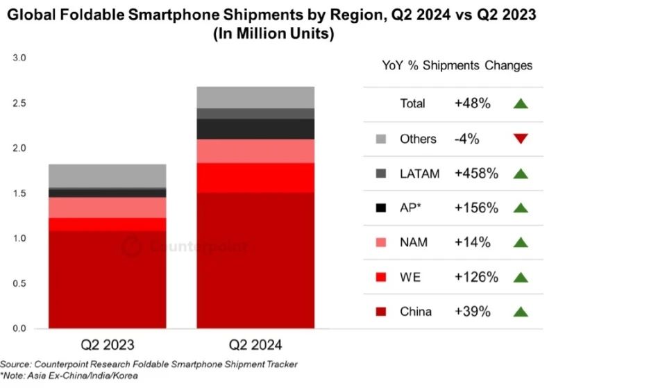 9 月 5 日消息,來自市場調(diào)查機(jī)構(gòu) Counterpoint Research 數(shù)據(jù)顯示,2024 年第 2 季度全球折疊屏手機(jī)出貨量同比增長 48%,中國繼續(xù)引領(lǐng)全球折疊屏手機(jī)市場增長,占總出貨量的一半以上。而西歐已經(jīng)成為僅次于中國的第二大折疊屏市場,榮耀、三星、摩托羅拉、OPPO、OnePlus 甚至谷歌等品牌都在這里展開激烈競爭。