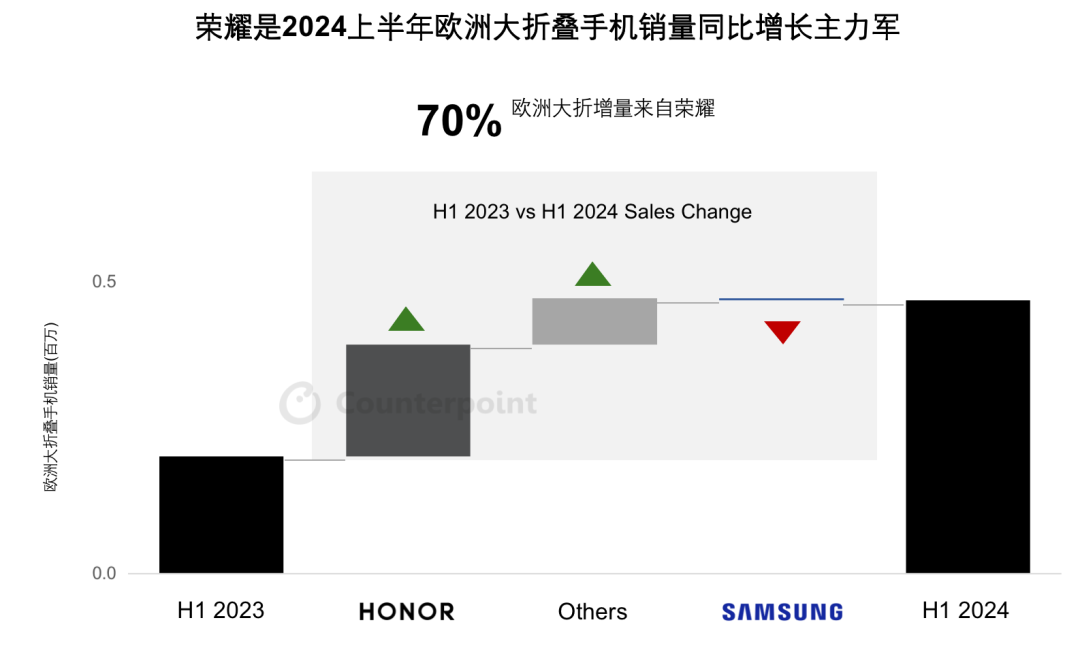 另一組數(shù)據(jù)顯示,2024 年 H1 同比 2023 年 H1,歐洲大折疊 70% 的銷量增長來自榮耀,也就說,歐洲大折疊銷量增長的 70% 都由榮耀貢獻(xiàn)。