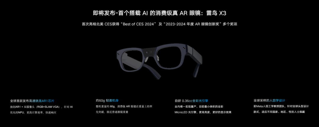 在 MicroLED + 光波導領域,公司繼 2023 年發布并量產全球首款雙目全彩 MicroLED 光波導 AR 眼鏡雷鳥 X2 后,對光引擎的設計及量產工藝進行了全新升級,使得新一代全彩 MicroLED 光引擎體積較前代大幅下降了近 50%,光機量產良率提升至 95%。同時,得益于工藝改良、波導設計和關鍵算法上的突破,新一代 AR 眼鏡雷鳥 X3 整機重量將下降至約 60g,續航時間較上一代提升了近一半,而入眼顯示亮度提高了一倍以上。