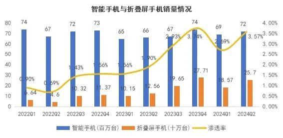 折疊屏憑借更大幅的創(chuàng)新、更新鮮的產(chǎn)品體驗(yàn)成為高端手機(jī)市場發(fā)展的主要趨勢,華為發(fā)布的全球首款三折疊手機(jī)更是引爆市場。2022-2024年在疲軟的手機(jī)市場中,折疊屏手機(jī)市場表現(xiàn)亮眼,出貨量整體保持高速增長,未來隨著品類滲透逐漸提升,折疊屏手機(jī)有望成為高端市場的中堅(jiān)力量。