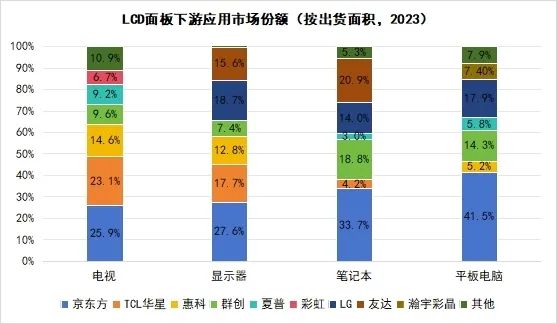 京東方在各應(yīng)用領(lǐng)域均均處于領(lǐng)先地位,TCL華星在電視和顯示器市場相對(duì)領(lǐng)先,LG在顯示器、筆記本和平板電腦領(lǐng)域有一定市場份額,群創(chuàng)在筆記本和平板電腦領(lǐng)域占據(jù)一定市場份額,友達(dá)則在顯示器和筆記本領(lǐng)域相對(duì)領(lǐng)先。