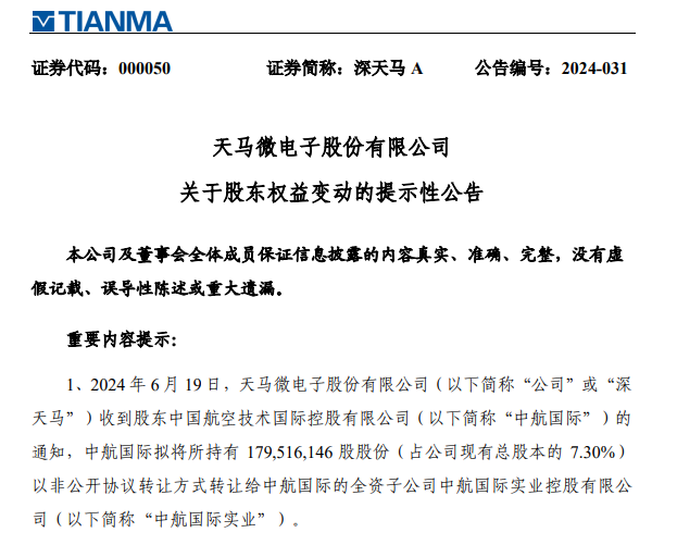 公告顯示,深天馬于2024年6月20日披露了《關于股東權益變動的提示性公告》、《簡式權益變動報告書(中航國際)》和《簡式權益變動報告書(中航國際實業)》,2024年6月19日,中國航空技術國際控股有限公司(以下簡稱“中航國際”)與中航國際的全資子公司中航國際實業控股有限公司(以下簡稱“中航國際實業”)簽署了《中國航空技術國際控股有限公司與中航國際實業控股有限公司關于天馬微電子股份有限公司之股份轉讓協議》,中航國際實業根據股權轉讓協議受讓中航國際直接持有公司的179,516,146股股份(占公司總股本的7.30%),本次股權轉讓的受讓方中航國際實業受本次轉讓方中航國際控制,且均為國有股東,此次交易采用協議轉讓方式。