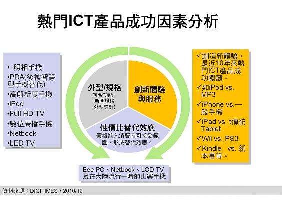 2000至2010年成功的ICT產品,黃銘章分析,其成功因素可分為外型/規格、性價比替代效應以及創造新體驗與服務3大類。規格提升是塑造產品差異化的最主要方式,諸如采用低溫多晶硅TFT LCD面板的PDA或高分辨率手機、講求超薄時尚的LED TV均是;而創造創新體驗或服務,則是建立長期市場成功的關鍵方向,例如iPhone相對于一般手機、電子紙相對于傳統紙張等。