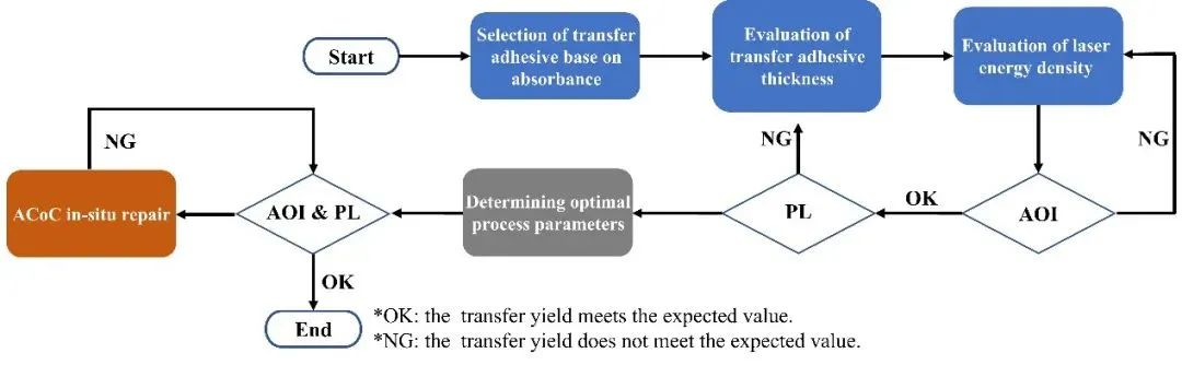 針對超高像素密度Micro-LED全彩顯示屏對芯片激光巨量轉移定位精度與良率的嚴苛要求,團隊提出一種激光巨量轉移過程的多因子關聯決策方案,如圖3所示。包括:1)基于激光與轉移膠相互作用模式,對轉移膠類型選擇進行綜合評判;2)激光能量范圍與轉移膠厚度關聯調控,確保在無損傷情況下實現芯片的高精度、高良率轉移;3)采用自動光學檢測(AOI)/PL檢測定位,對不良芯片進行原位修復。