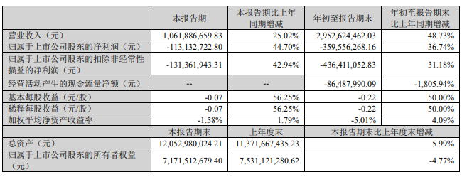 其中,第三季度實現營收10.62億元,同比增長25.02%;歸屬于上市公司股東的凈虧損為1.13億元,較上年同期收窄44.7%;歸屬于上市公司股東的扣除非常性損益的凈虧損為1.31億元,較上年同期收窄42.94%。