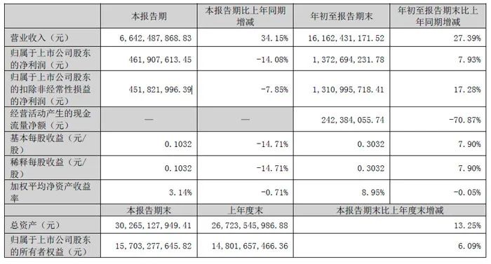 其中,第三季度實現營收66.42億元,同比增長34.15%;歸母凈利潤4.62億元,同比下降14.08%;扣非凈利潤4.52億元,同比下降7.85%。