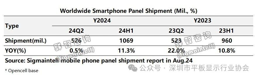 2024年上半年全球智能手機(jī)智能面板出貨約10.7億片(Open Cell口徑),同比增長約11.3%,其中二季度出貨約5.3億片。