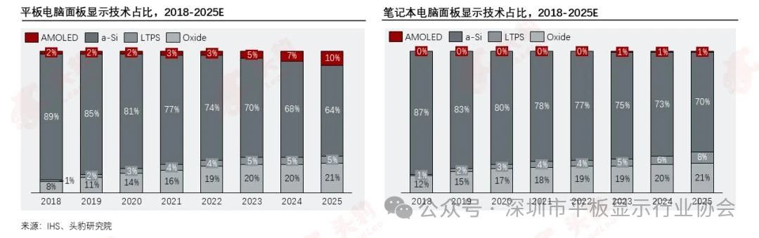 目前,a-Si薄膜晶體管液晶顯示屏的表現(xiàn)足以滿足筆記本電腦和平板電腦的需求,因此成為這類設(shè)備面板的主流產(chǎn)品。IGZO薄膜晶體管液晶顯示屏在中大尺寸面板上具有更大優(yōu)勢,預(yù)計(jì)其在筆記本電腦和平板電腦面板市場的份額將逐步增加,占據(jù)主要高端市場。AMOLED和LTPS薄膜晶體管液晶顯示屏整體滲透率仍然不高,預(yù)計(jì)到2025年在平板與筆記本電腦產(chǎn)品滲透率分別為10%與1%。