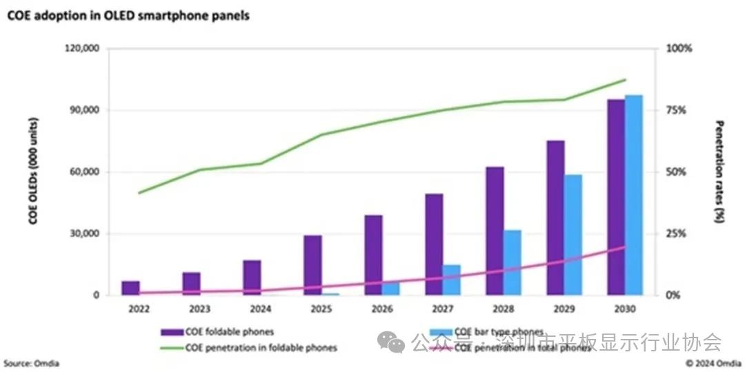 COE技術(shù)將逐步取代傳統(tǒng)的圓偏光片,成為降低OLED智能手機(jī)在環(huán)境光線下反射和眩光的主要解決方案。預(yù)計(jì)到2030年,近90%的可折疊手機(jī)和近20%的OLED智能手機(jī)(約10億部)將采用COE技術(shù)。