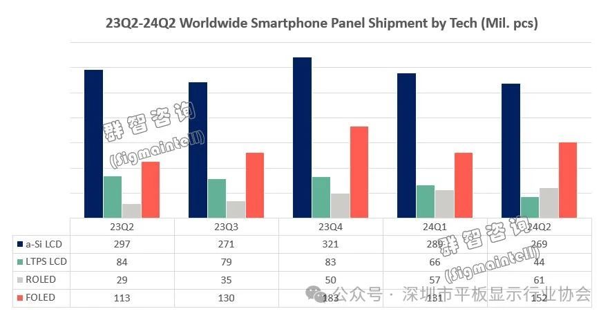 各不同技術(shù)別面板出貨仍然分化,a-Si LCD和OLED出貨同比持續(xù)增長。