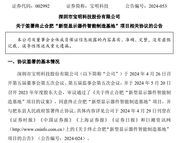 公告顯示,2021年2月,肥東縣與寶明科技簽署了《肥東縣人民政府與深圳市寶明科技股份有限公司新型顯示器件智能制造基地項(xiàng)目投資合作協(xié)議》及其補(bǔ)充協(xié)議(以下簡(jiǎn)稱(chēng)《投資協(xié)議》),約定了寶明科技在合肥市肥東縣境內(nèi)設(shè)立項(xiàng)目公司,總投資15億元,建設(shè)新型顯示器件智能制造基地項(xiàng)目,現(xiàn)因行業(yè)環(huán)境發(fā)生變化,無(wú)法繼續(xù)推進(jìn)該項(xiàng)目建設(shè),經(jīng)寶明科技申請(qǐng),雙方友好協(xié)商一致,雙方同意終止該協(xié)議。雙方一致同意于2024年10月10日終止雙方于2021年2月簽署的《投資協(xié)議》。