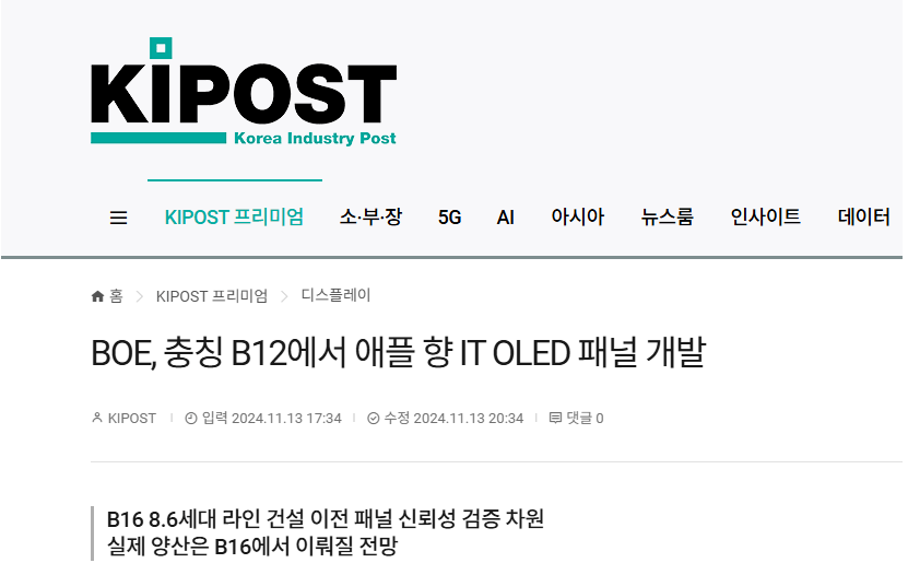 11月14日消息,據韓媒報道,京東方在重慶 B12 的6代OLED面板廠為蘋果公司開發 IT 用OLED面板,這是為了在B16 8.6代OLED產線投產之前驗證面板的可靠性。