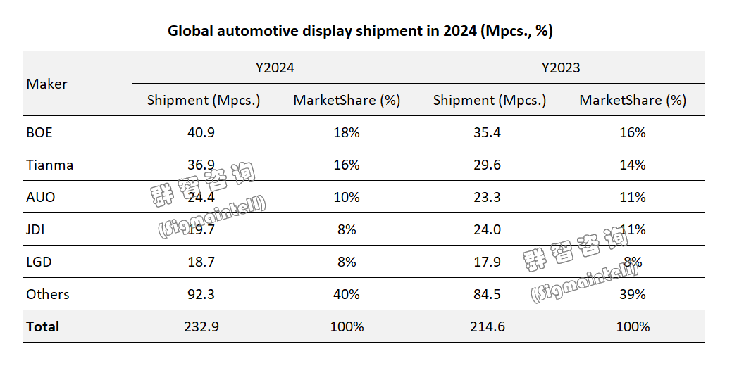 2024年友達車載業務穩健增長,出貨約為 2440 萬片,占 10.0% 的市場份額位居全球第三。AUO在車載顯示技術方面一直保持著較高的研發水平,不斷推出具有創新性的產品,如曲面設計、大尺寸貼合以及AmLED等尖端顯示技術方面等,在高端車載面板市場占據一席之地。2024年更是確定了融合BHTC(Behr-HellaThermocontrol)子公司資源的戰略,整合了車用顯示器與人機交互界面的研發,致力于構建先進的智慧車艙系統解決方案,深化布局車載顯示產業和拓展國際市場,為公司的長遠發展注入了新的活力和競爭優勢。