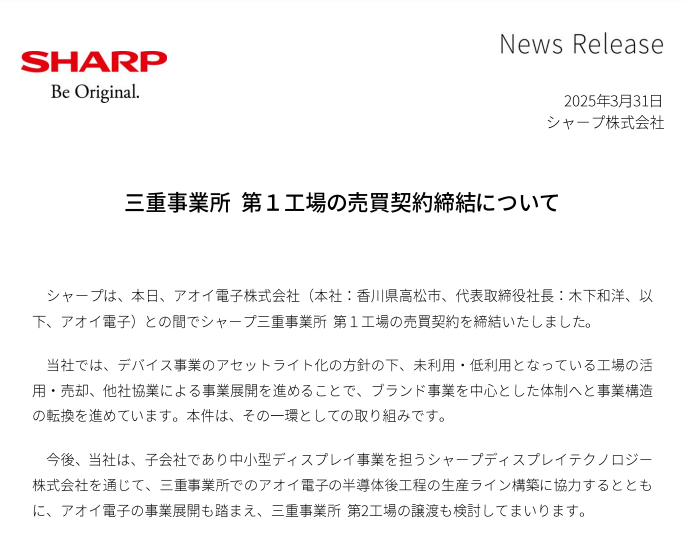3月31日,夏普宣布與日本半導體企業アオイ電子株式會社(Aoi Electronics)簽署協議,將位于三重縣的三重事業所第1工廠出售給Aoi Electronics。