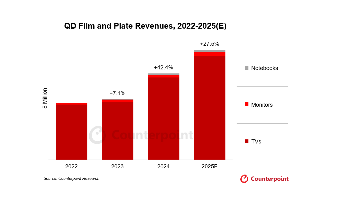 近日,市調(diào)機(jī)構(gòu)Counterpoint Research在報(bào)告中指出,2024年量子點(diǎn)薄膜和擴(kuò)散板的收入同比增長42% 。這一增長主要由QD-LCD和MiniLED電視推動(dòng)。盡管去年筆記本電腦市場規(guī)模相對較小,但其收入增長了228%,部分原因是蘋果最終在MacBook Pro中采用了量子點(diǎn)技術(shù)。