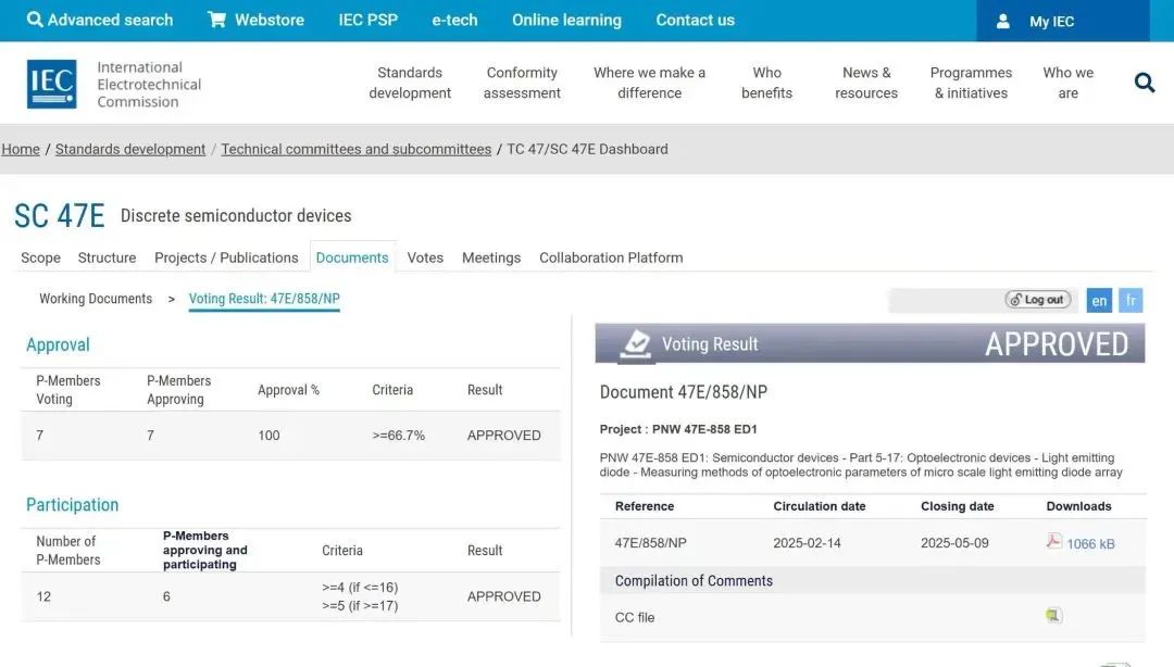 近日,維信諾參股子公司辰顯光電在國際電工委員會(IEC)牽頭制定的國際標準提案《半導體器件 第5-17部分:光電子器件 發光二極管 微型發光二極管陣列器件光電參數測試方法》通過了新工作項目提案(NP)投票。NP投票是國際標準從提案建議階段進入正式起草階段的重要節點,通常由國家成員體提出申請,國際標準化組織按照“一國一票”的原則組織各成員國進行投票表決。