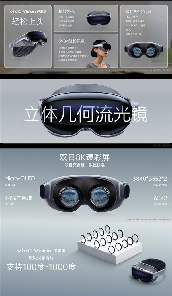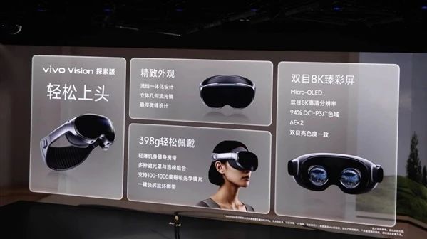 據(jù)悉,vivo Vision探索版的最大看點(diǎn)之一是輕便,這款頭顯重量壓縮至398g,是目前行業(yè)內(nèi)最輕的MR頭顯。作為對(duì)比,蘋果Vision Pro的重量超過(guò)了600g。