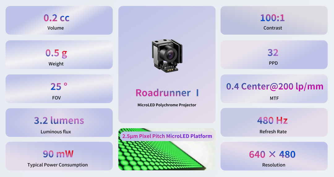 與LCoS等傳統AR光引擎相比,“走鵑Ⅰ”在像素尺寸、體積、重量、對比度、刷新率及典型功耗等關鍵指標上實現了超越,成為打造輕量級全彩AR智能眼鏡的首選顯示方案。目前,“走鵑Ⅰ”彩色光引擎已正式開放送樣。