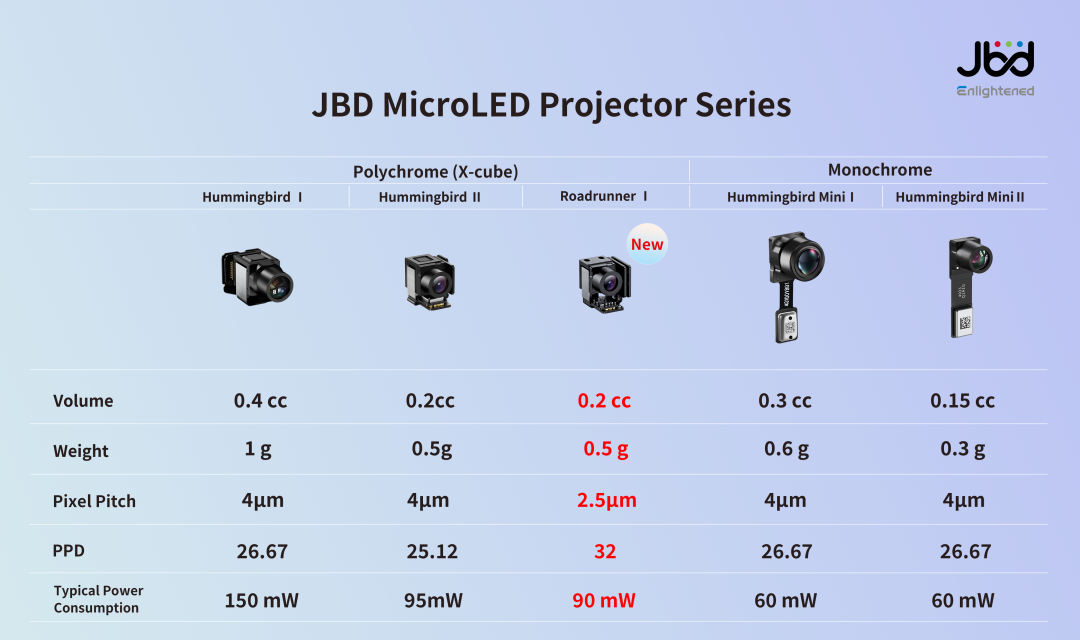 隨著“走鵑Ⅰ”的發布,JBD已構建起清晰的MicroLED光引擎產品矩陣:“蜂鳥”系列專注于輕量化主流市場,持續推動消費級AR設備的普及;全新“走鵑”系列則聚焦極致視覺,以超緊湊體積、更高角分辨率、更大視場角樹立顯示性能新標桿。兩大系列協同,為AR/AI智能終端產業注入強勁動能。