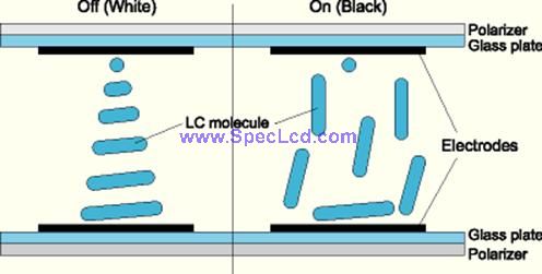 如果施加電壓,在我們的狀況中是一個垂直電場,將會摧毀液晶的螺旋結構。這些分子會試著將他們自己排列成與電場相同的方向。在我們的例子里,那樣表示它們最后會與第二塊濾片垂直。在這個狀態下,偏向入射光線會通不過整個子像素(ON狀態)。白點變成了黑點。