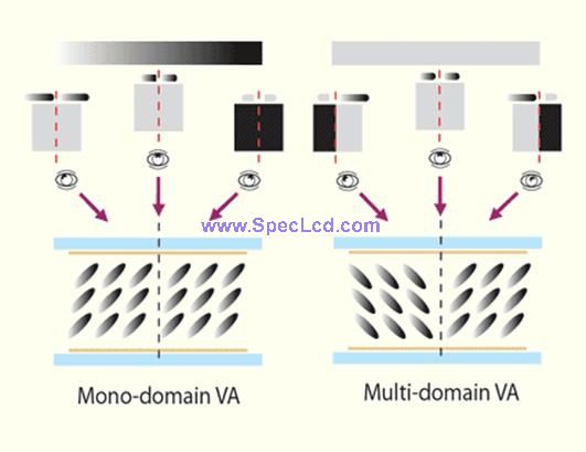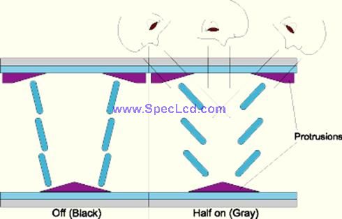 這一次,每個次像素分開到數個區域中。而且,偏向濾片不再是平坦而是突起的。結果是,液晶體不會以同一方向來排列或旋轉。突起濾片是術語「ridges」的來由。這也導出了專有名詞「multi-domain(多區域)」。子像素被分成數個區域而在其中液晶體可以自由來去在相反的方向,而獨立于其它液晶體。這技術的目的是盡可能創造需要的區域而讓使用者只察覺一個區域,而不管他們在畫面的什么地方。
