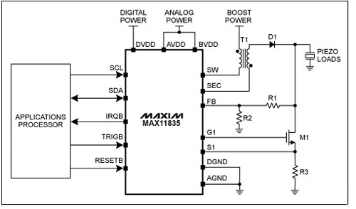 單芯片觸覺反饋方案,如 MAX11835相比于傳統分立設計有很多優勢:較小的印制電路板尺寸、較低功耗、精簡的材料清單(BOM)以及簡單的軟件支持。考慮到壓電體尺寸也很小, MAX11835對于手持設備是極具吸引力的解決方案。