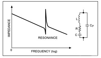 壓電體中運轉的電機系統可以用主介質電容CP并聯由LRC組成的串聯網絡來模擬(圖4)。達到諧振頻率之前,阻抗會像電容一樣隨頻率上升而下降。所以,當壓電體工作在遠低于諧振頻率時,可以僅用一個電容CP來模擬。