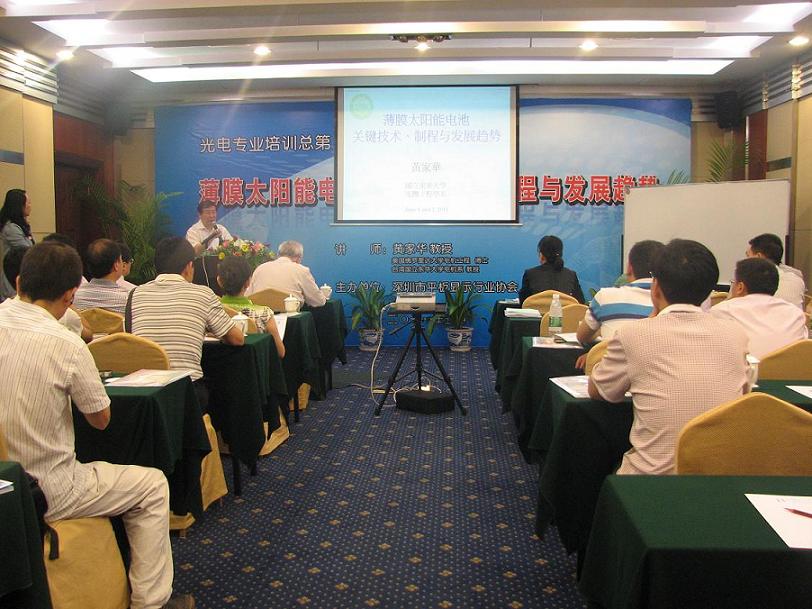 2011年6月1--2日,由深圳市平板顯示行業(yè)協(xié)會舉辦的“薄膜太陽能電池關(guān)鍵技術(shù)、制程與發(fā)展趨勢”培訓(xùn)在深圳明華國際會議中心如期召開。共計30名來自各地光電企業(yè),還有部分光學(xué)企業(yè)的管理者、技術(shù)人員、市場人員參加了此次“薄膜太陽能電池關(guān)鍵技術(shù)、制程與發(fā)展趨勢”的專業(yè)知識培訓(xùn)。深圳市平板顯示行業(yè)協(xié)會秘書長孫政民先生在開學(xué)儀式上致辭并講話。