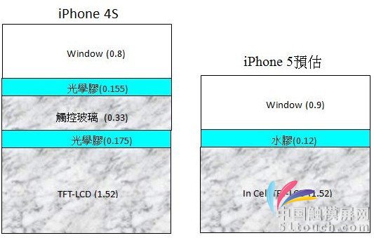 這一款iPhone的厚度只有7.6mm,較iPhone 4S的9.3mm薄了1.7mm(18%),也贏過對手Galaxy S3的8.6mm。且來看看In-cell架構對這次厚度薄化的貢獻,外掛觸控模組的iPhone 4S,其面板模組的整體厚度為2.98mm;采用In-cell Touch的iPhone 5,少掉了ITO玻璃及一層貼合膠材,所用的貼合膠材也將從光學膠改為水膠,未增加In Cell玻璃面板之強度,保護玻璃(Cover Lens/Window Glass)可能會改為0.9mm之厚度,因此iPhone 5所采用之面板模組總厚度預估為2.54mm,薄化貢獻為0.44mm,占1.7mm的1/4強。
