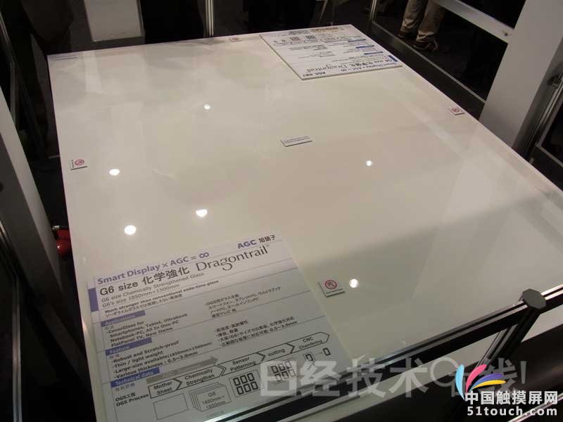 旭硝子在“FPD International 2012”上,展出了支持1850mm×1600mm即第6代尺寸的化學強化玻璃“Dragontrail”,主要用于在智能手機和平板電腦表面的玻璃蓋板上形成觸摸傳感器的“玻璃罩一體型技術”。該公司介紹稱“已于2012年夏季之前開始量產供貨”。