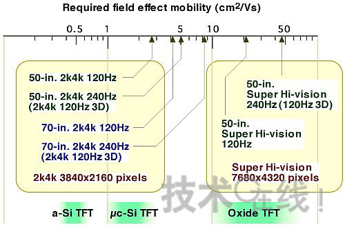 圖3:對新一代FPD要求的TFT遷移率進行的匯總 50英寸和70英寸面板的2K×4K面板以及50英寸超高清面板的示例。在得到ITC'10允許后從發表資料轉載而來。